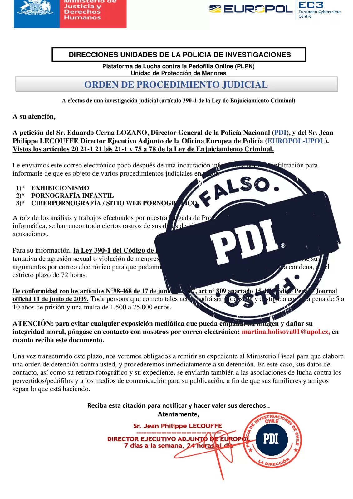 La Policía de Investigaciones (PDI) emitió una alerta a la ciudadanía por la circulación de un correo electrónico falso que simula ser una orden de procedimiento judicial o demanda.