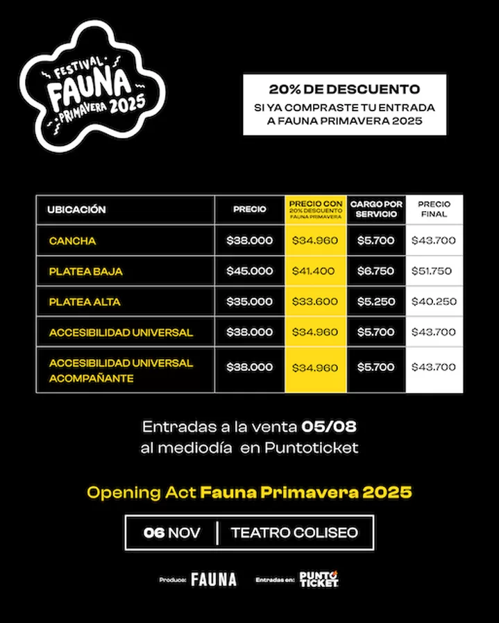 La venta de entradas para el Opening Act de Fauna Primavera, estará disponible el 5 de agosto a partir del mediodía vía Puntoticket. Quienes adquirieron su pase para el festival, tienen un 20% de descuento.