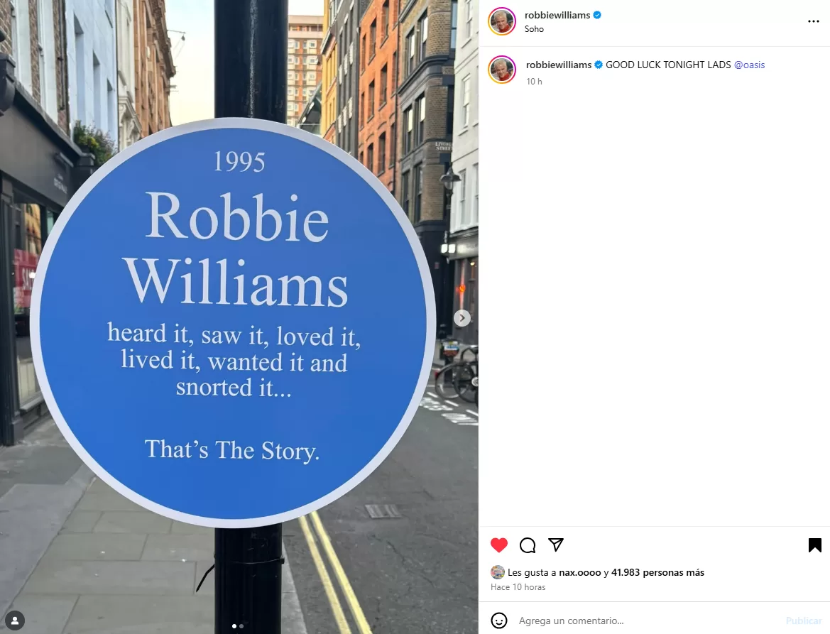 Williams develó una placa azul en Londres en honor a Oasis el día en que la banda se reunirá en vivo. La placa se ha instalado en Berwick Street, en el Soho, donde se encuentra la icónica portada del segundo álbum del grupo "(What's The Story) Morning Glory?" (1995).