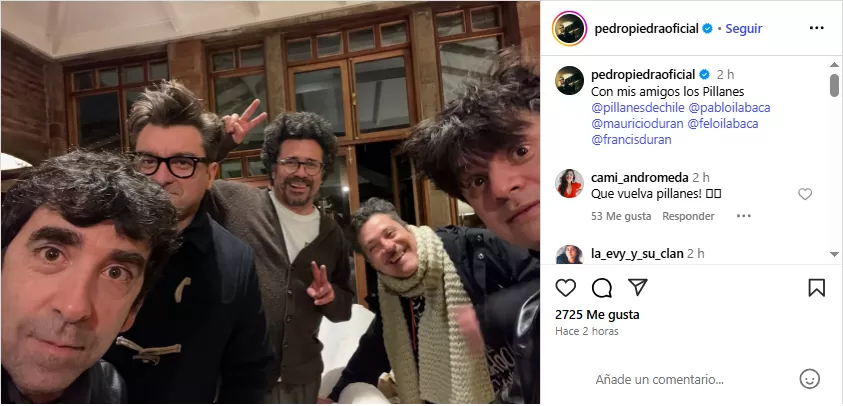 La foto compartida por Pedropiedra incluye la descripción "con mis amigos los Pillanes", además de las etiquetas correspondientes a la banda, Felipe Ilabaca, Pablo Ilabaca, Mauricio Durán y Francisco Durán. La toma fue compartida también por el menor de los Ilabaca, quien comentó "la pillanada".