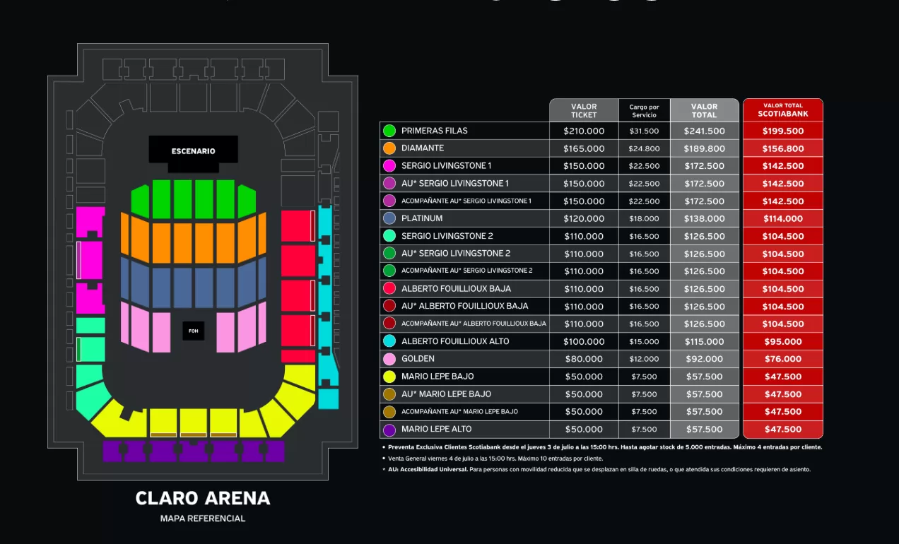 Respecto a cuándo comprar las entradas, habrá una Preventa Exclusiva Scotiabank, desde el jueves 3 de julio 3:00 pm. Esta tendrá un 20% de descuento pagando con tarjetas visa Scotiabank. Máximo 4 entradas por cliente. Hasta agotar el stock de descuentos de 5 mil entradas.
