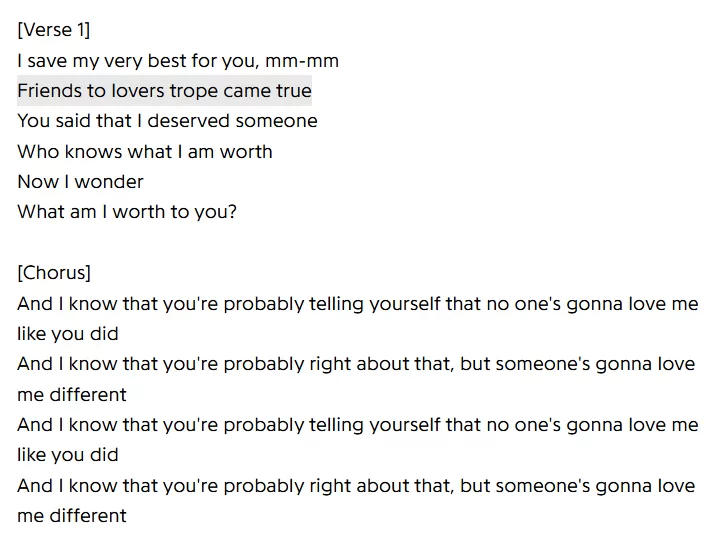"Guardé lo mejor de mi para ti / el cliché de amigos a amantes hecho realidad / dijiste que merecía a alguien que supiera cuanto valgo / ahora me pregunto / ¿cuánto valgo para ti?", comienza la letra de la canción, haciendo clara referencia a su relación con Taylor, que partieron siendo amigos por años.