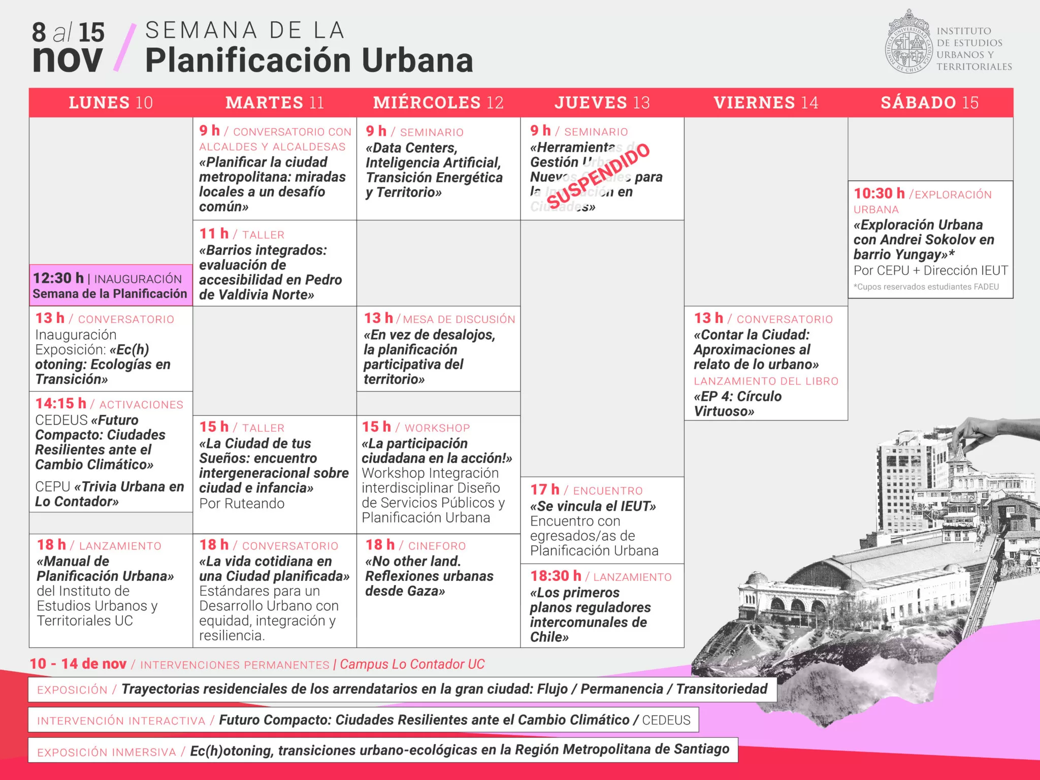 Durante la Semana de la Planificación Urbana 2025 habrá charlas, conversatorios, seminarios, talleres, exposiciones y salidas a terreno. Además, el programa está pensado para estudiantes, académicos, profesionales, municipios, organizaciones y personas interesadas en la ciudad. De esta forma, se busca juntar miradas distintas y construir ideas en común.