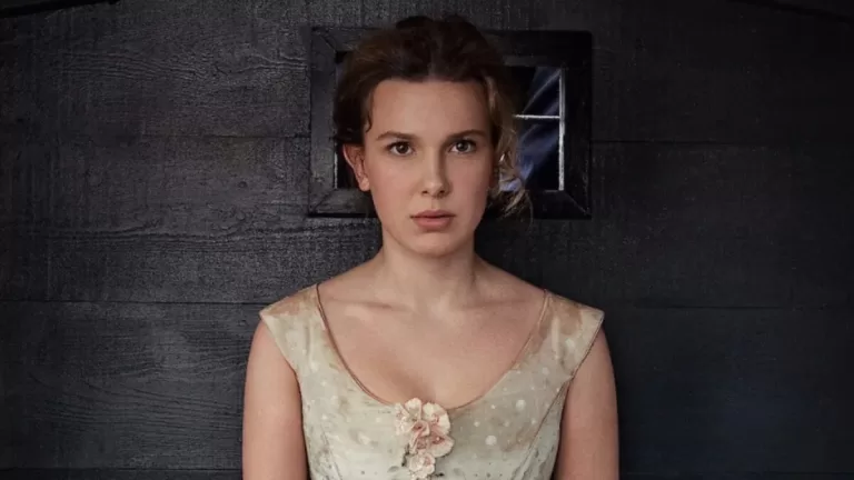 En la imagen se puede ver a la actriz junto a Louis Partridge mirándose fijamente mientras él está arrodillado ofreciéndole una flor. Millie lo mira con cara de sorpresa luciendo su cabello largo y vestimenta de época.