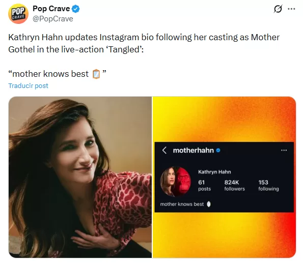 Kathryn Hahn alcanzó gran popularidad en los últimos años por su interpretación de Agatha Harkness en la serie "WandaVision". Esa experiencia ha llevado a muchos seguidores a considerar que su perfil encaja con la personalidad manipuladora y teatral de Madre Gothel.