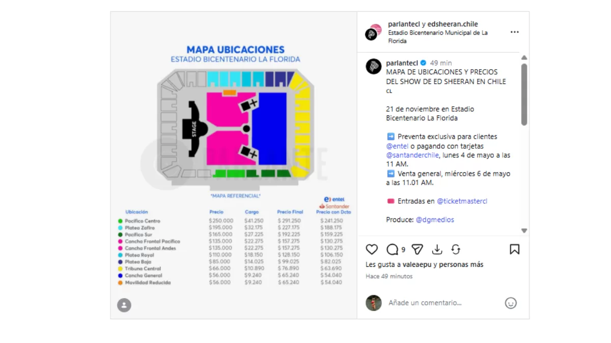 Sobre el costo de las entradas, estas van desde los $65.000 pesos chilenos hasta los $291.000.