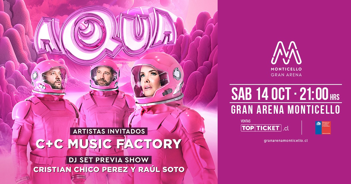 El próximo 14 de octubre se presentará Aqua con C+C Music Factory en el Gran Arena Monticello. Las entradas para la cita noventera se pondrán a la venta por el sistema Topticket.cl desde el lunes 29 de mayo a las 11:00 am.