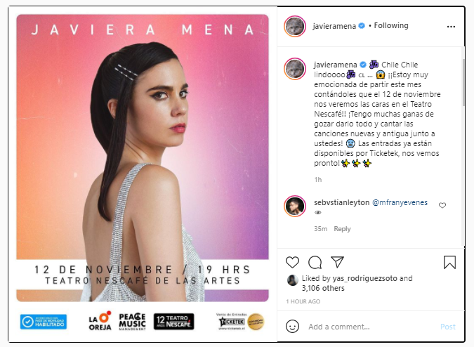Oye tú que has viajado tanto, a preparar las espadas para este viaje en el tiempo, ya que por fin encontraremos la joya que se nos perdió en el centro de la discoteca. Javiera Mena sube al siguiente nivel y anuncia en redes sociales un show presencial en el Teatro Nescafé de las Artes.