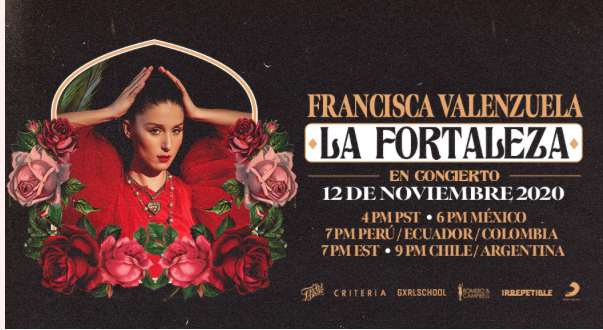 El evento será transmitido vía streaming para todo Latinoamérica y el mundo, el jueves 12 de noviembre de 2020. Serán un show en vivo con trabajo escénico, visuales y el color que caracteriza a esta artista chilena con las 14 canciones que componen su más reciente producción «La Fortaleza».