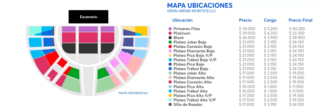 Las entradas estarán disponibles por el sistema Ticketmaster y los valores van desde $11.500 a $40.250. Revisa el mapa a continuación.