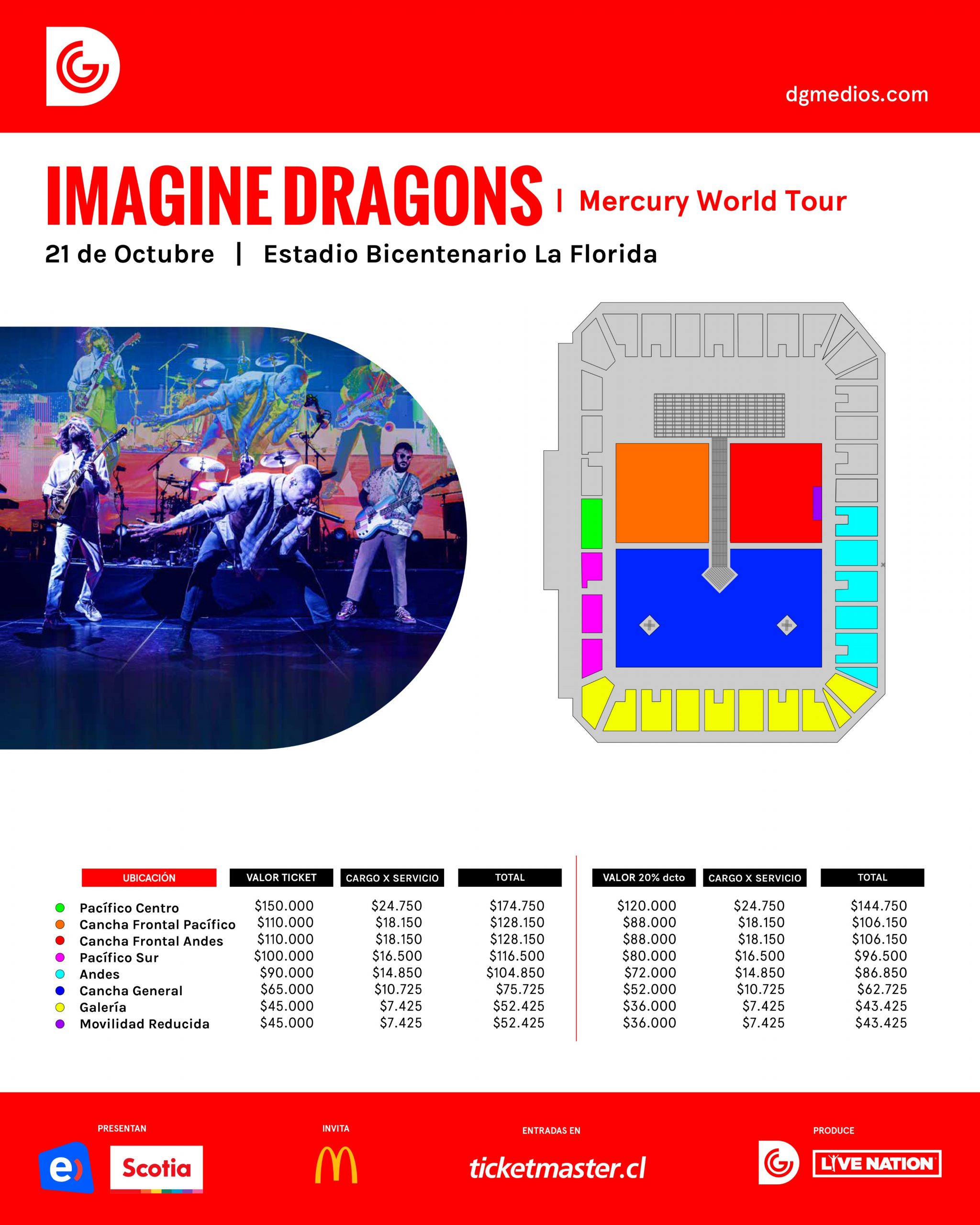 Los precios para ver a Imagine Dragons en Chile irán desde los $45 mil en Galería hasta los $150 mil de Pacífico Centro. Además, habrá un descuento exclusivo para clientes de Scotiabank y Entel, con un 20% menos en el valor final.