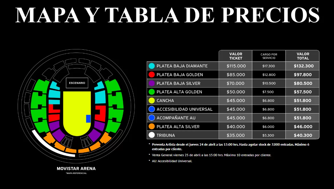 Respecto a los precios, estos van desde los $40.300 en tribuna, $51.800 en cancha, y $132.300 en Platea Baja Diamante. Revisa los detalles en el mapa a continuación.