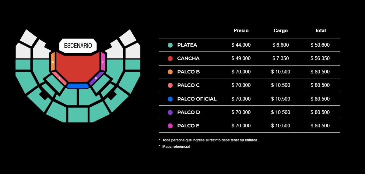 Respecto a los precios de Stone Temple Pilots en Chile, estos van desde los $50.600 en Platea hasta los $80.500 en Palco, incluyendo el cargo por servicio.