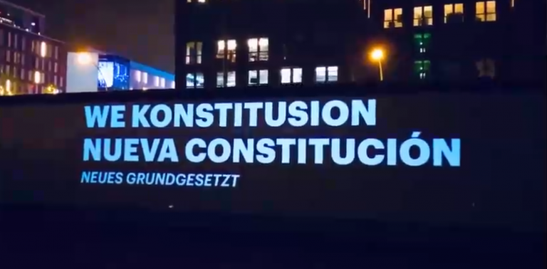 Las imágenes proyectadas en lo que quedó del muro tras su caída en 1989, pedían una "nueva constitución" y detener el "terrorismo de Estado".